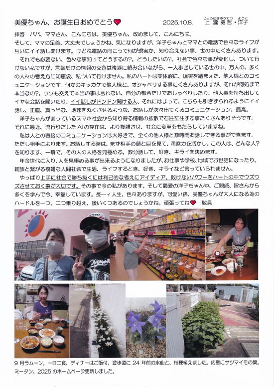 ◎洋子ちゃんからのメッセージ…… いつもフンワカ可愛い私の子供達と孫のミータン♡、電話の声から明るい声が聞けます。ありがとう。そして私達の配慮も、ありがとう。夏休みに行橋に来て大きくなったミータンと、アレと、コレと遊んでみたいと想ってましたが、大人の社会、色々あって、しかたないね~。でも、また会える日、たくさんありますので、そのときを楽しみに今、毎日ストレッチしています。 敬具